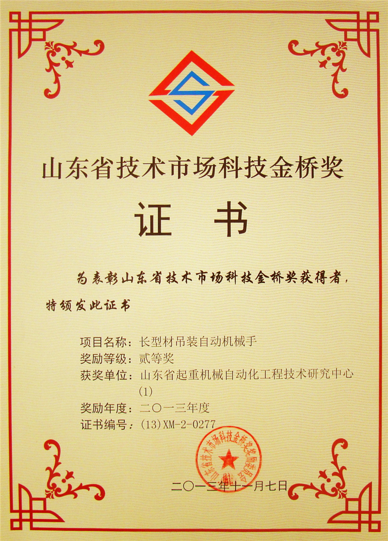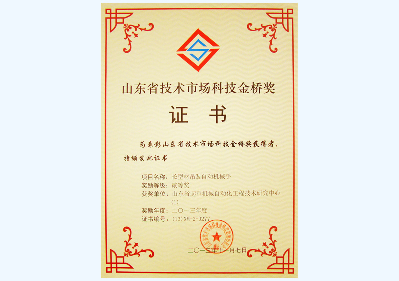 山东省技术市场科技金桥奖证书