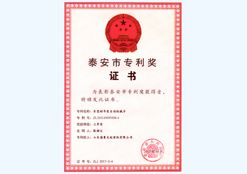 泰安市专利奖证书