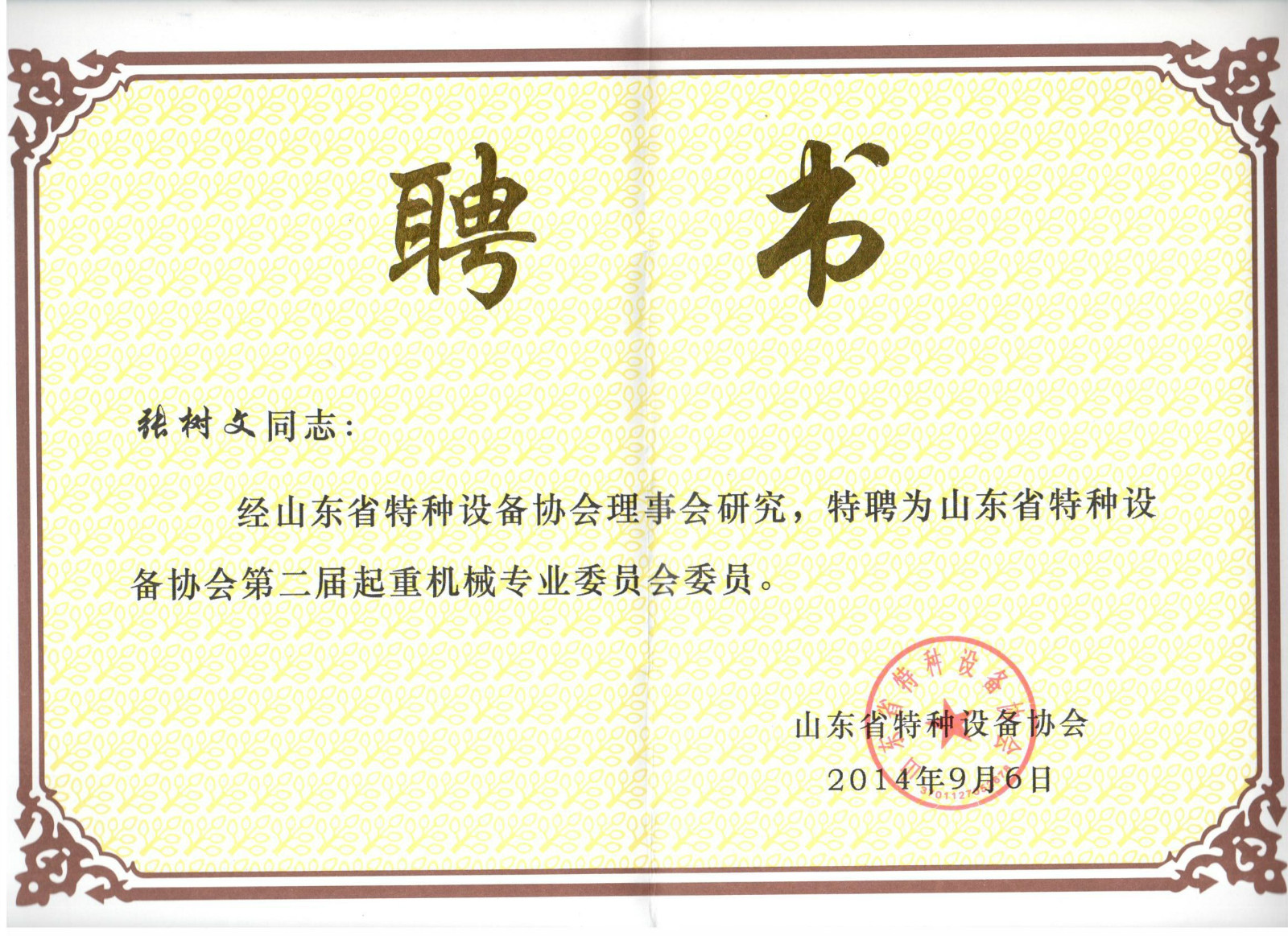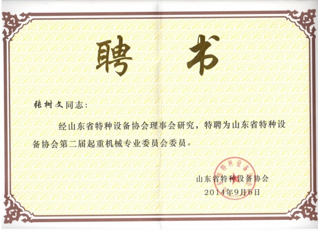 总经理先生被特聘为山东省特种设备起重机械专业委员会委员